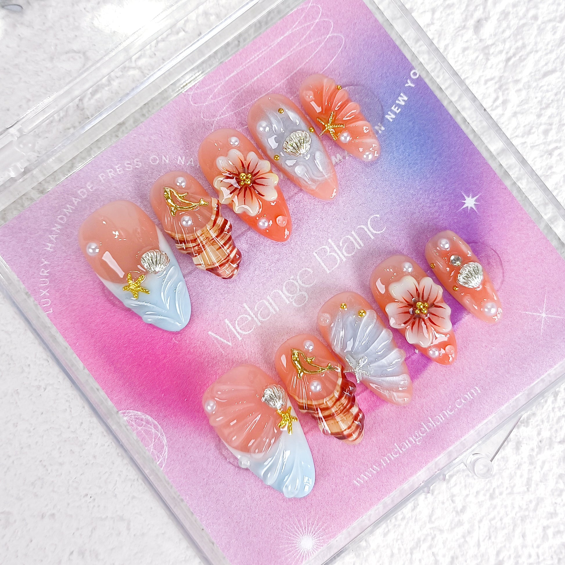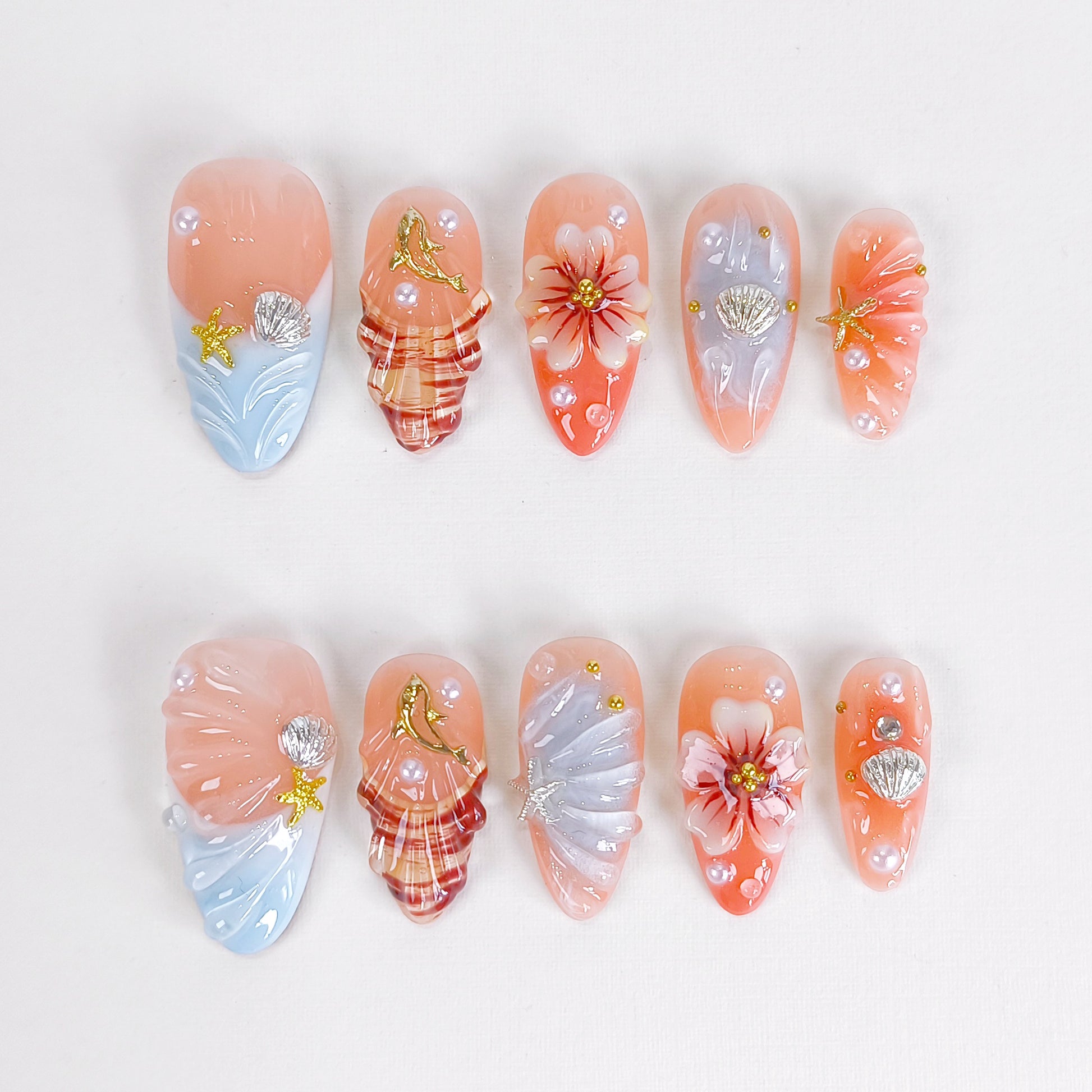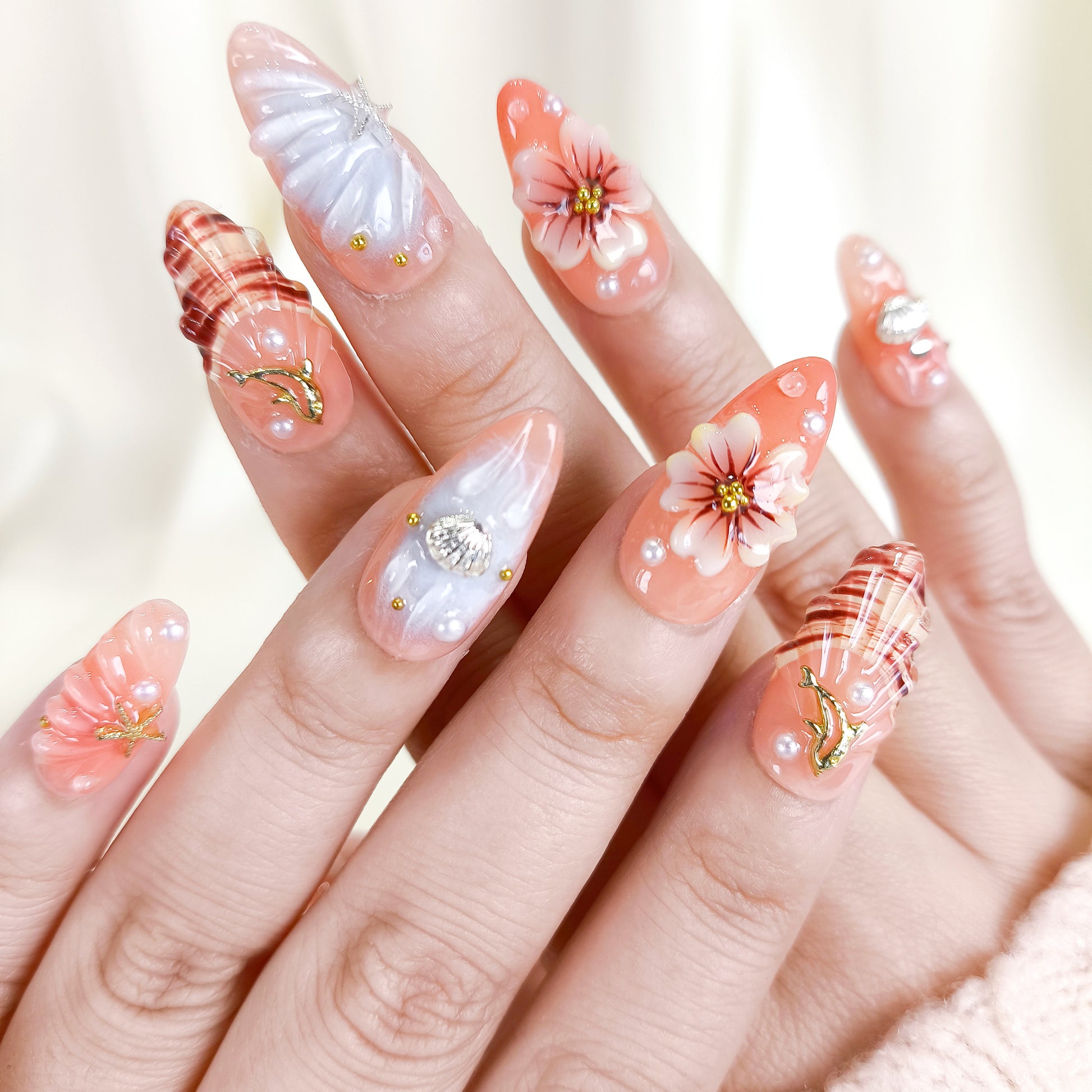 Tropical 3d flower press on nails are designed to bring a playful and vibrant look to your manicure, perfect for warm weather and sunny vibes. These blue ombre french nails and 3d shell french nails capture the essence of summer beach nails, making them an eye-catching choice for vacations or everyday wear. Finished with delicate pink flower nails, this set is ideal for anyone looking for cute nails that combine elegance with fun seasonal style. PO148