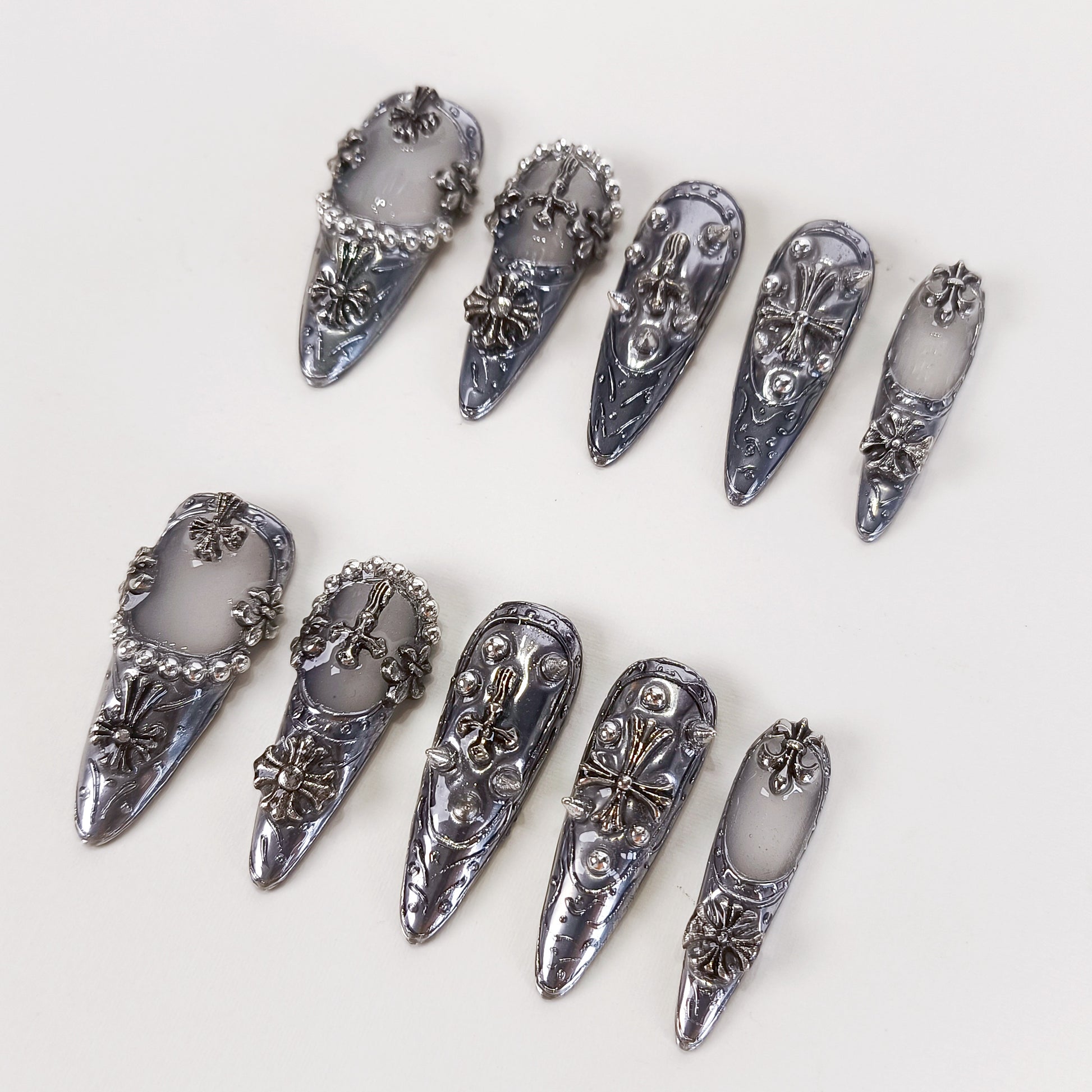 Silver Chrome Gothic Press On Nails bring a bold and edgy look, perfect for anyone who loves statement nail art with a dark aesthetic. These Punk Goth Y2K Fake Nails are designed in a dramatic stiletto shape with 3D silver stiletto nails that stand out for special occasions or everyday glam. Featuring silver cross nail art and a metallic silver nails finish, this set is reusable and easy to apply for instant gothic style. PO149