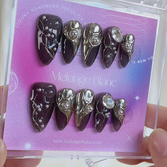 Make a bold statement with these almond-shaped black chrome nails, combining high-shine metallic sheen with dark, edgy allure. Designed for drama lovers, these 3D chrome nails bring a striking gothic nails aesthetic that's both fierce and fashion-forward. PO116