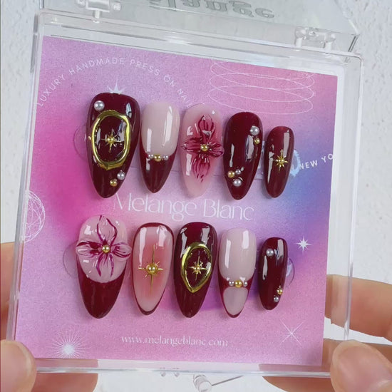 Burgundy 3D Flower & Gold Chrome Press On Nails - RTS