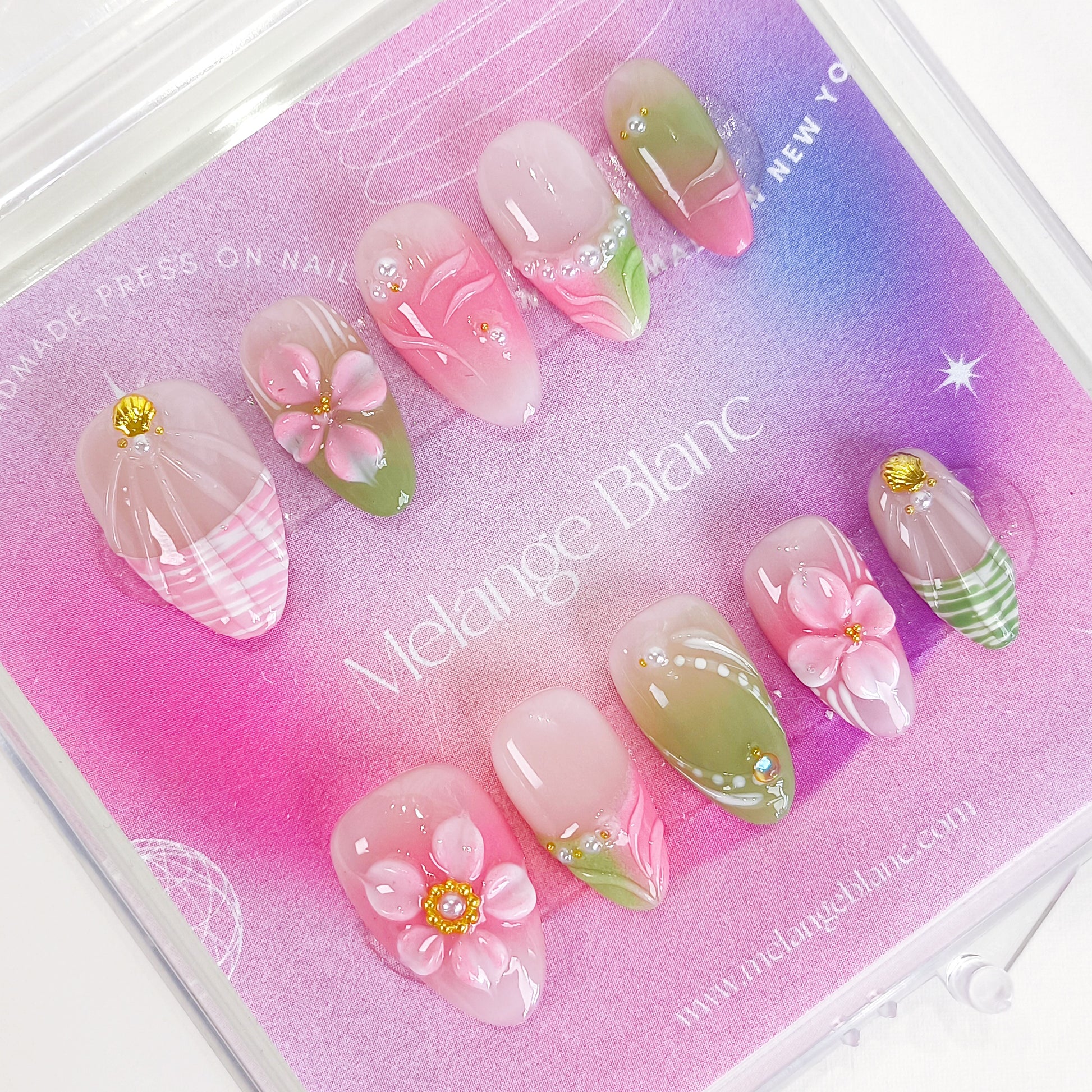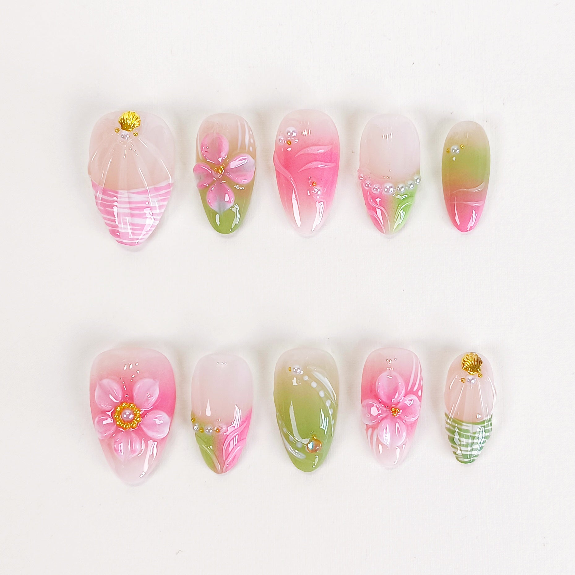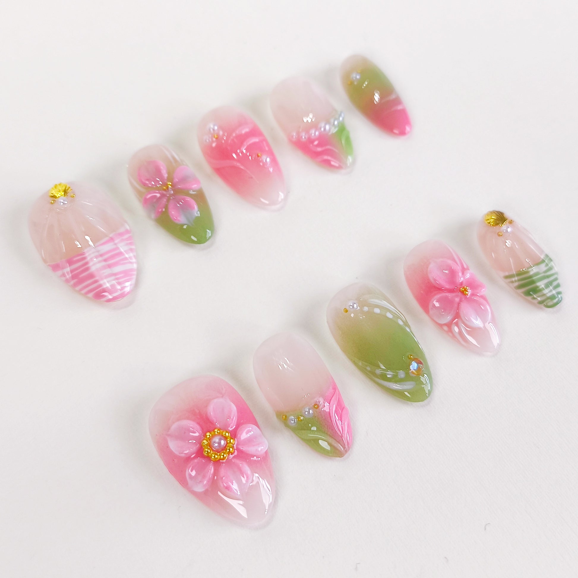 These 3d flower short almond nails feature delicate hand-sculpted blooms, pearl accents, and soft gradients for a fresh and feminine look. Perfect for everyday wear or special occasions, these pink flower nails add a romantic touch that’s both elegant and playful. Designed as reusable short nails, they’re easy to apply, comfortable to wear, and bring instant salon-quality style to your fingertips. PO144