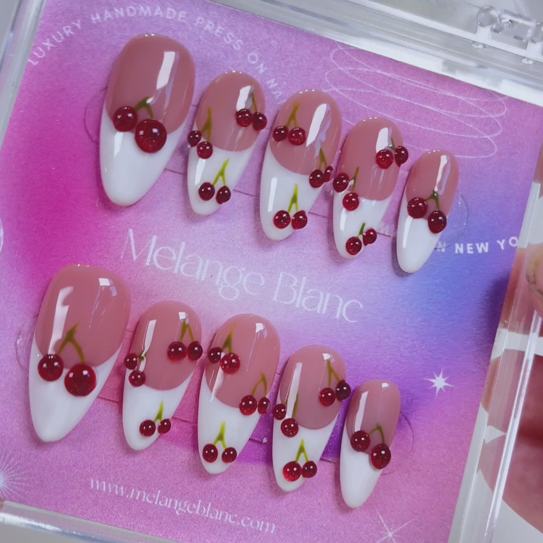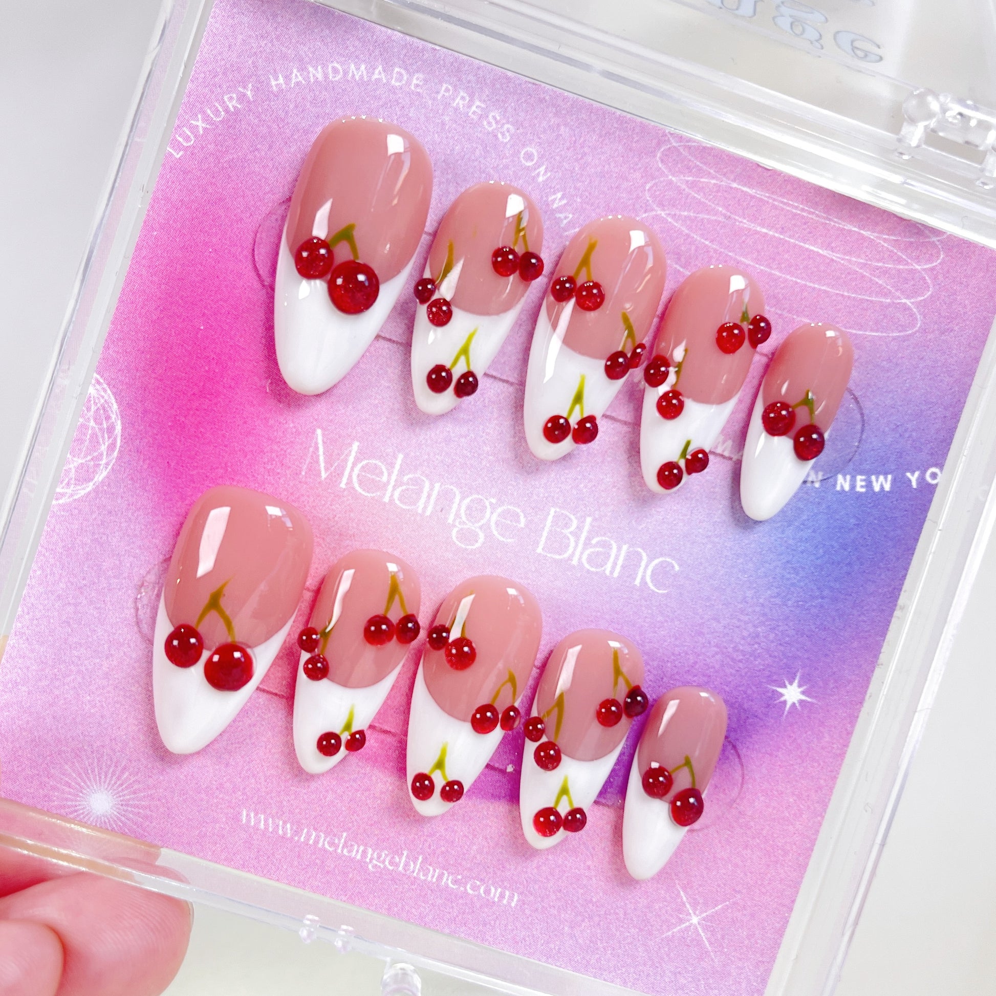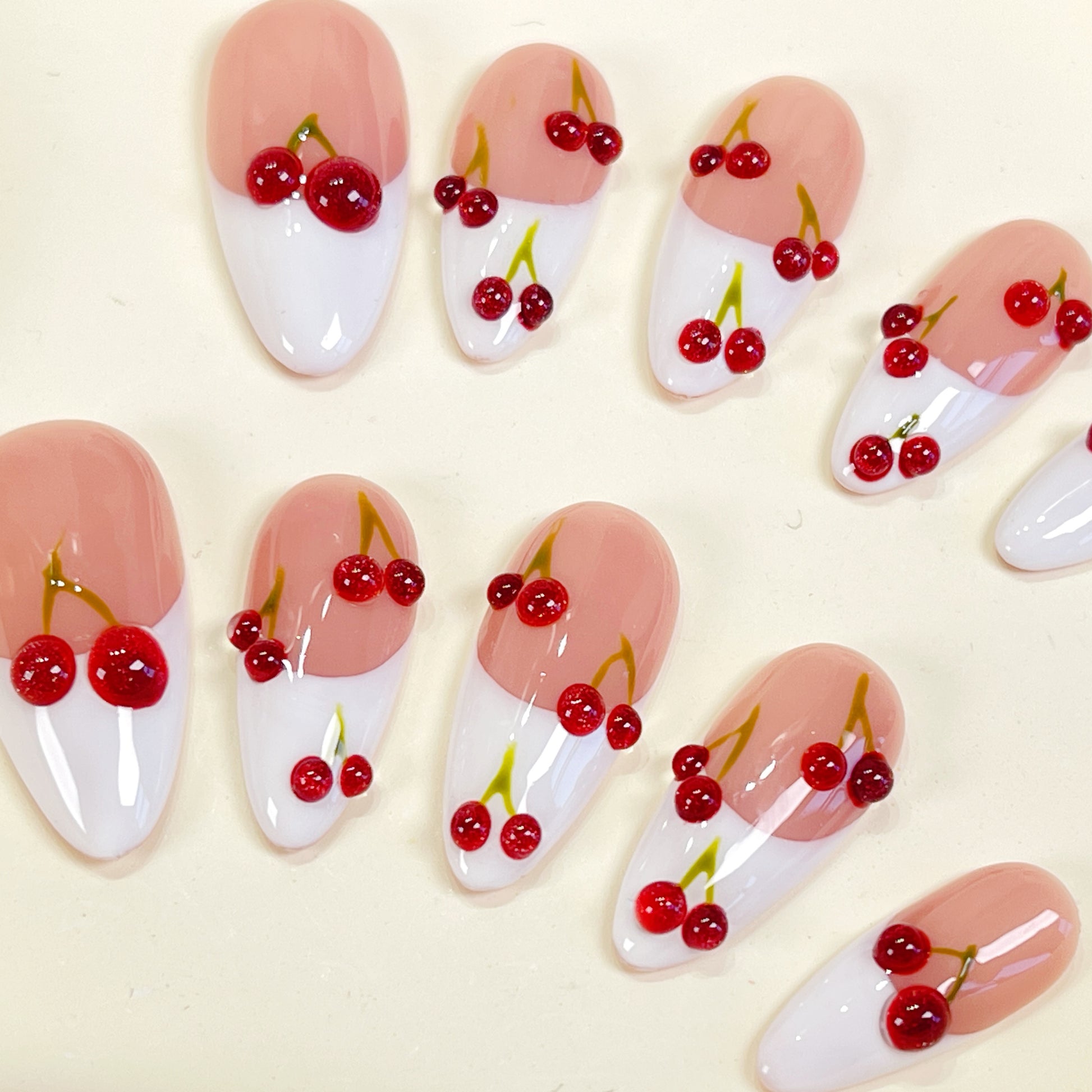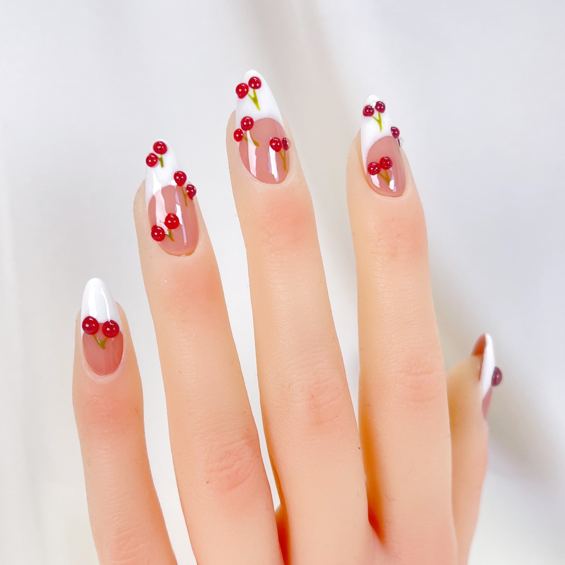 Elevate your nail game with our 3D Red Cherry French Tip Almond Press-On Nails! These cherry nails blend playful 3D fruit nail art with elegant white French tip nails, making them perfect for any occasion. Whether you’re sipping cherry soda or attending a chic brunch, these fun and flirty nails will have you looking berry fabulous! 🍒✨