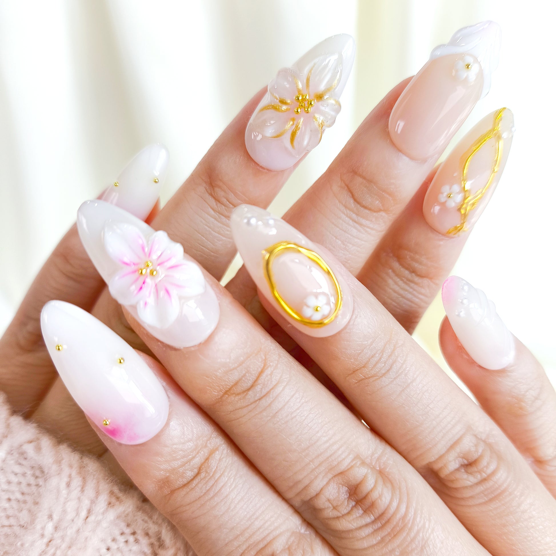 These white flower nails are delicately designed with hand-painted petals, 3D accents, and subtle gold details for a soft, romantic look. Blending blush tones and gentle gradients, these pink nails add a fresh and feminine touch that’s perfect for spring or everyday elegance. Lightweight, reusable, and easy to apply, they make the ultimate cute nails set for weddings, parties, or simply elevating your daily style. PO138